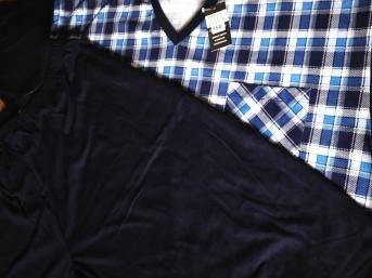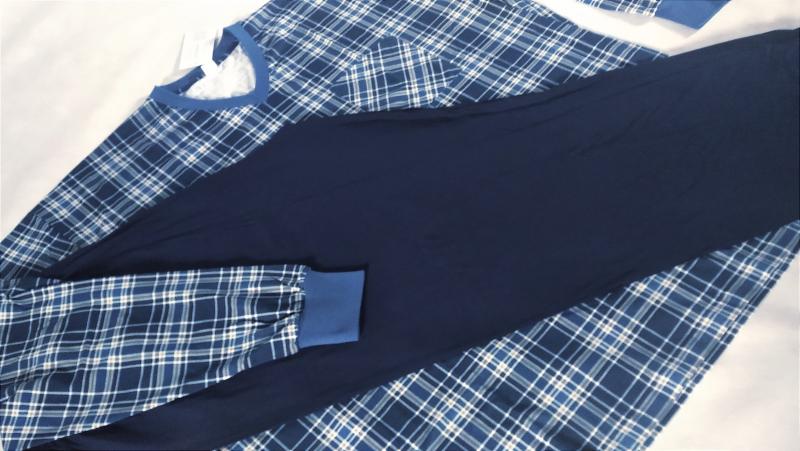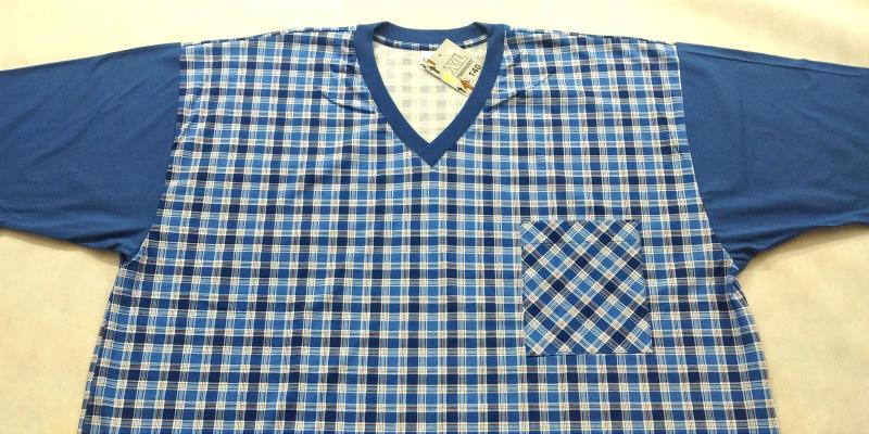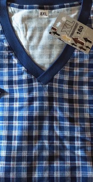 Piżama typu V z długim rękawem. Góra uszyta z dzianiny drukowanej ,ozdobiona ściągaczem i kontrastem na kieszeni. Spodnie jednokolorowe z możliwością regulacji gumy w pasie. 3xl...4xl...5xl...6xl...7xl...8xlSkład dzianiny-100% bawełna.Gramatura 150g/m2